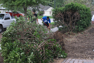 The bushes finally came out yesterday. It was very fun to watch them get removed. Mr. Joe (don't know sod man's last name) hired these two high school football players on spring break to come and manhandle the bushes. They did a fine job.
